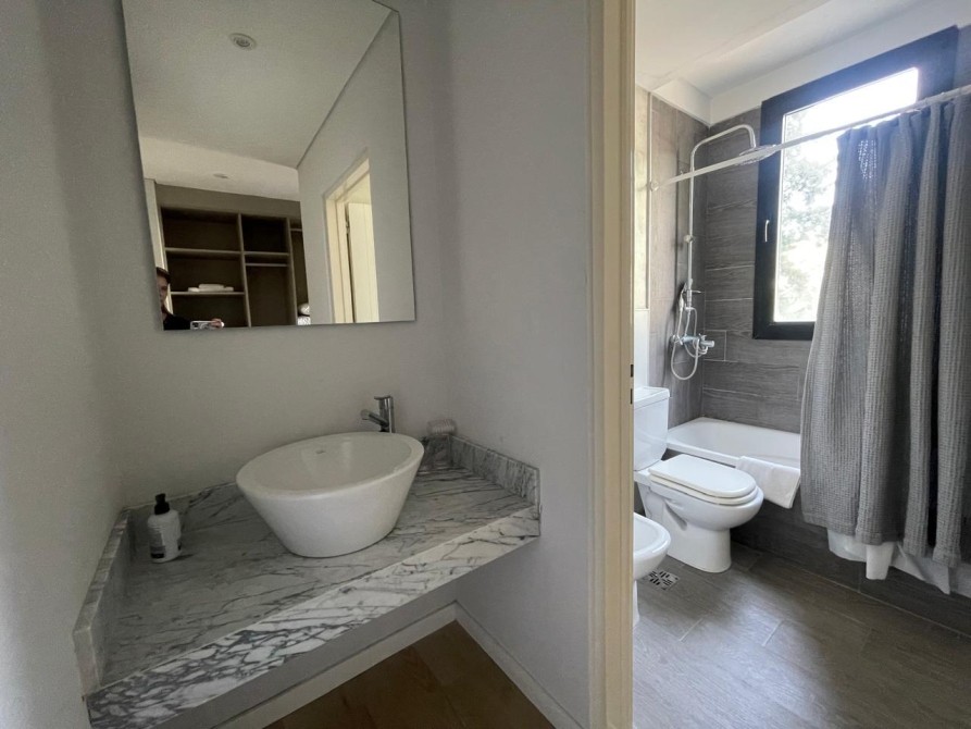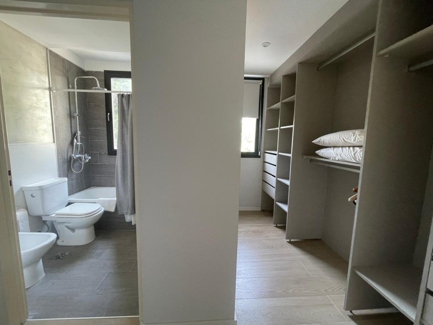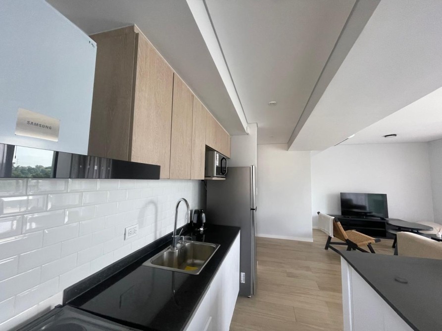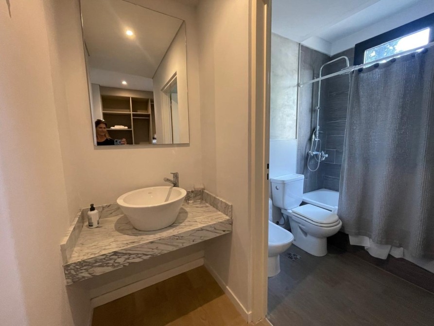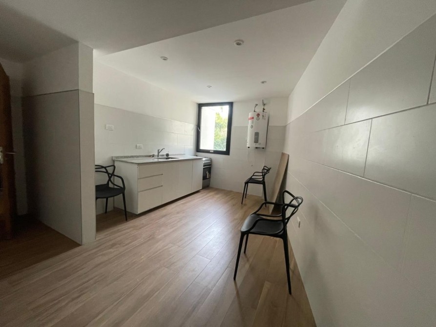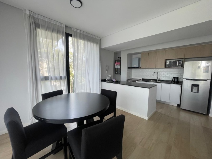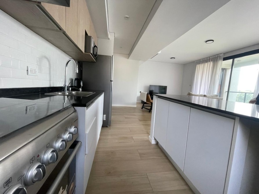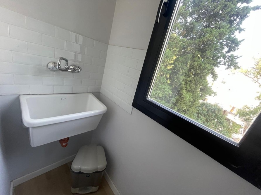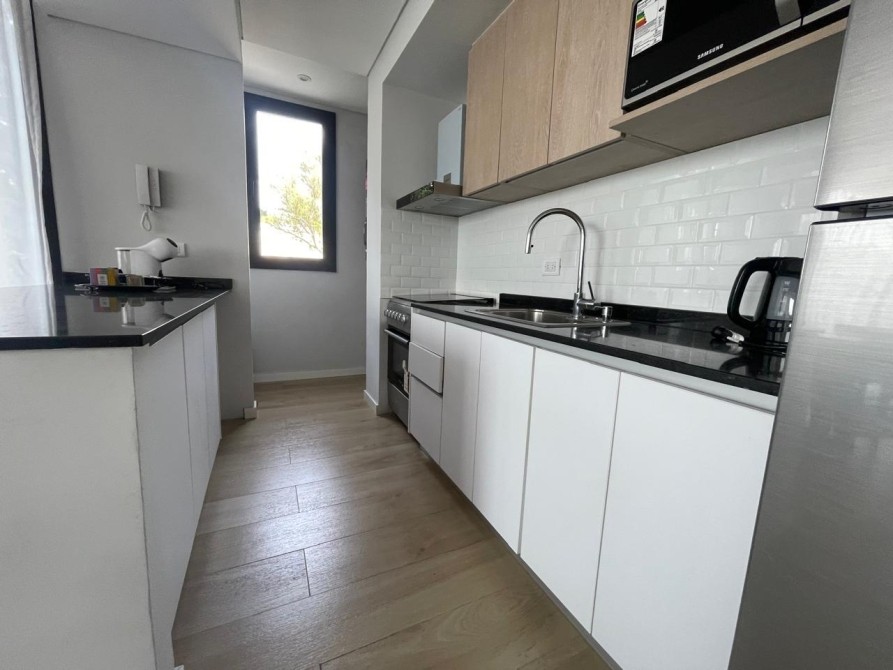 La cocina es moderna y funcional, completamente equipada con horno y anafe empotrados, muebles bajo mesada y alacenas laqueadas, grifería monocomando FV y lavadero independiente.
