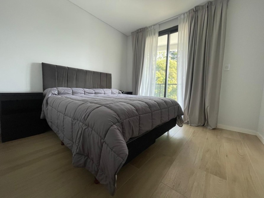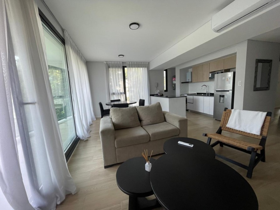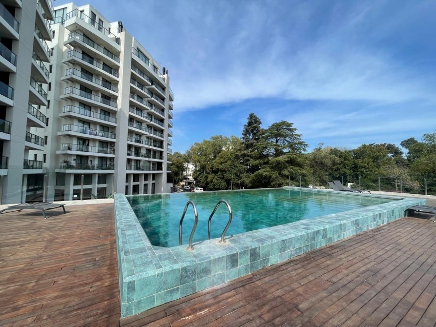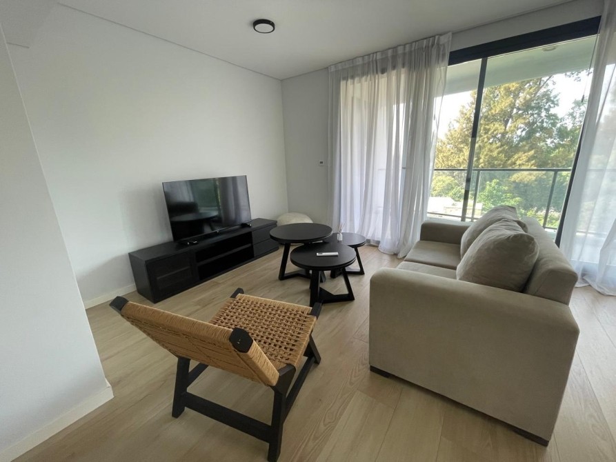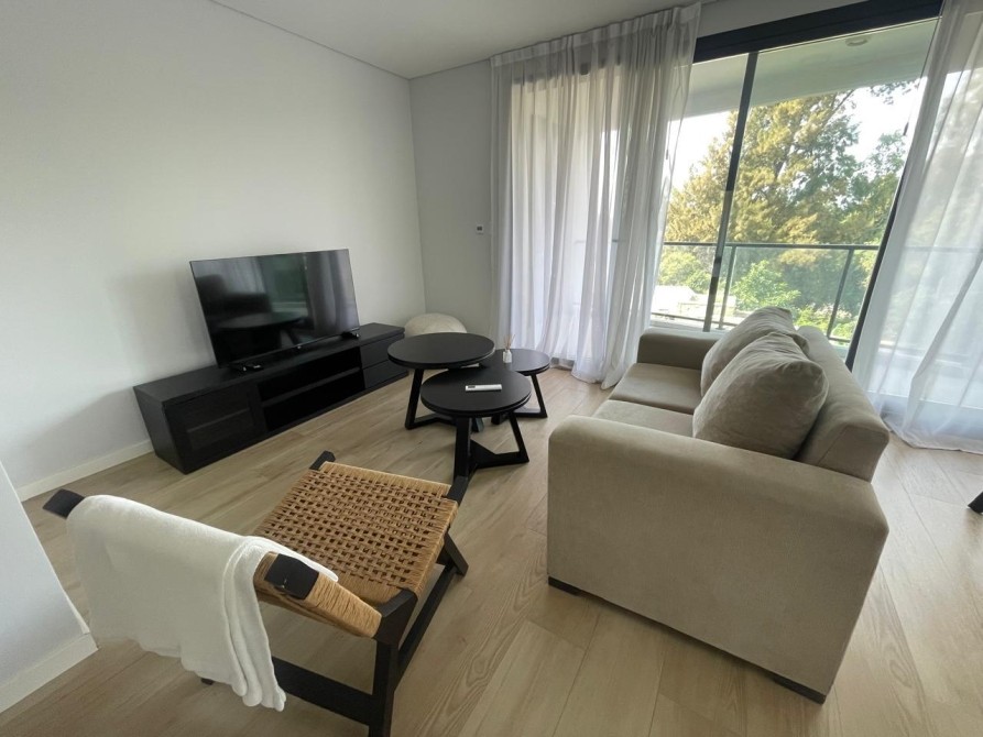 Al ingresar, se destaca un amplio y luminoso living-comedor con aberturas DVH de triple hoja, que conectan con un balcón terraza con parrilla empotrada revestida en acero y una hermosa vista abierta al golf.